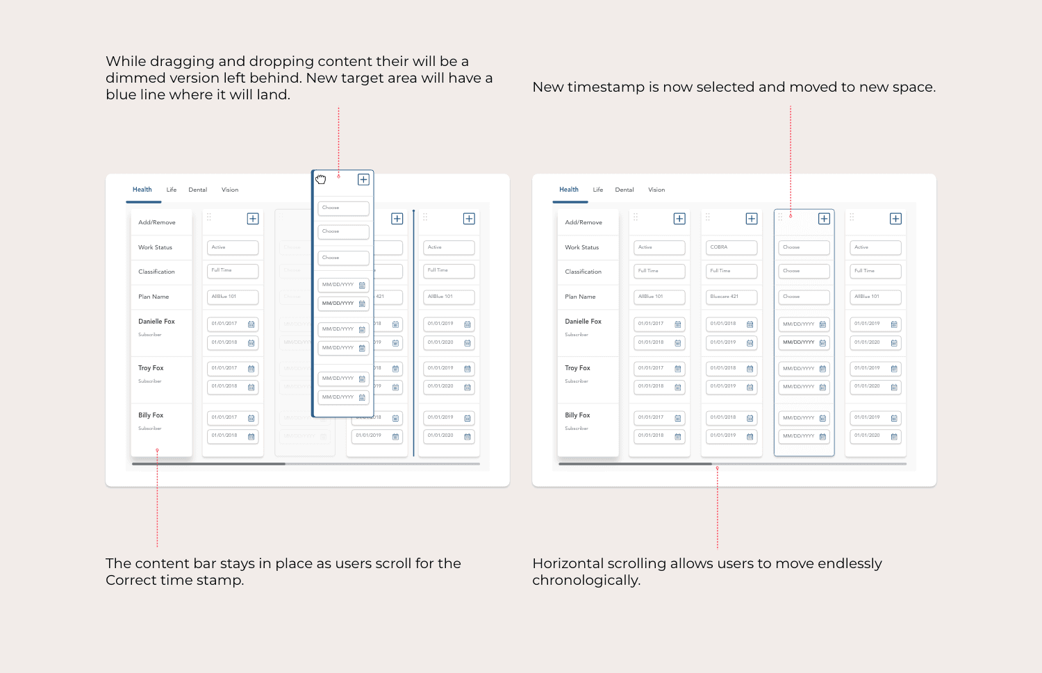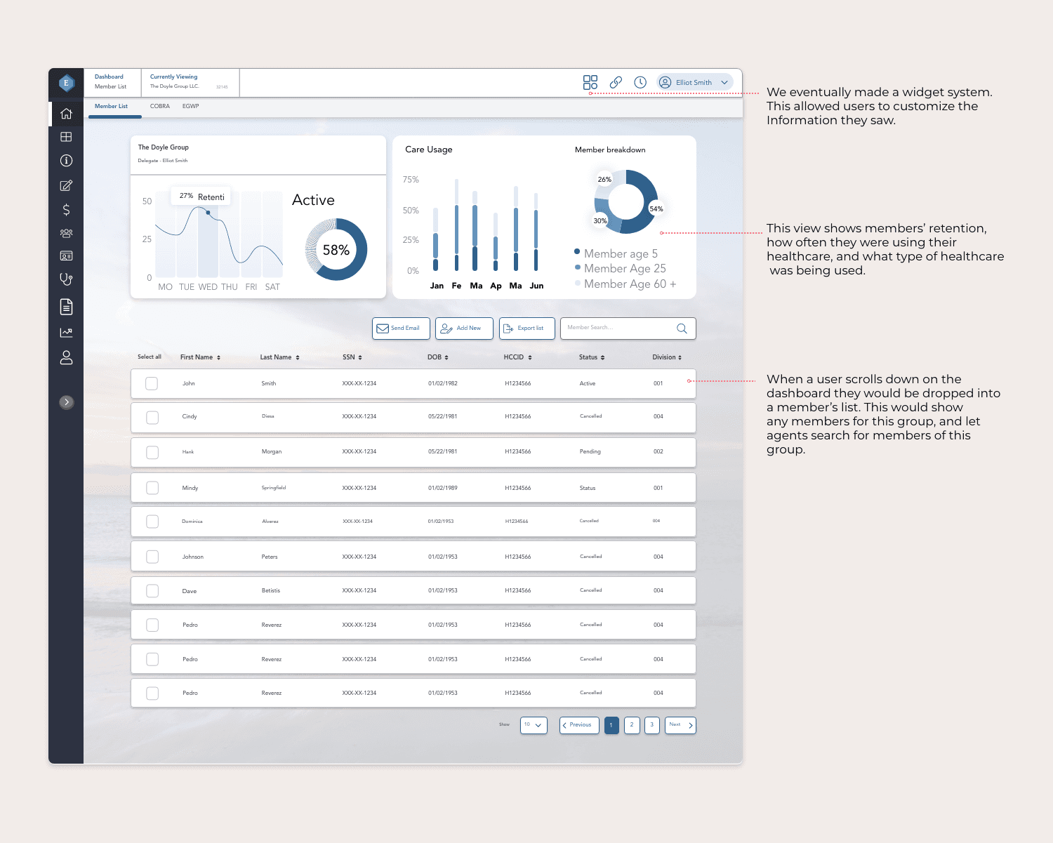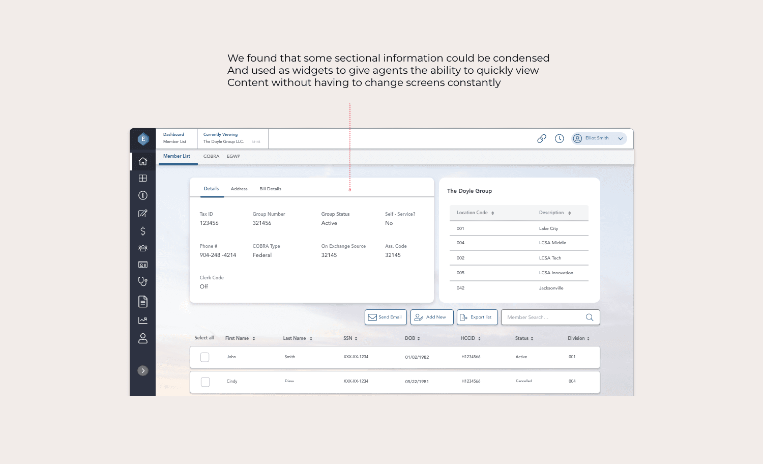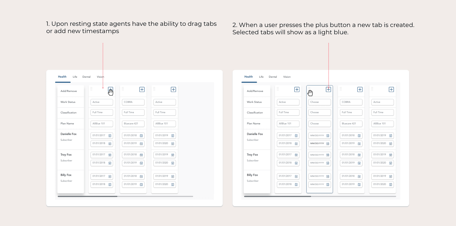 We redesigned the platform around clarity and predictability. Navigation was simplified with contextual, in-flow actions that eliminated unnecessary backtracking. Onboarding became a guided vertical flow that advanced naturally through sections. We restructured space for high-volume tasks, introduced a chronological time-stamping model for accurate member updates, and rebuilt the dashboard into modular widgets that surfaced key information without screen hopping. The result was a faster, more intuitive system that supported real agent behavior.