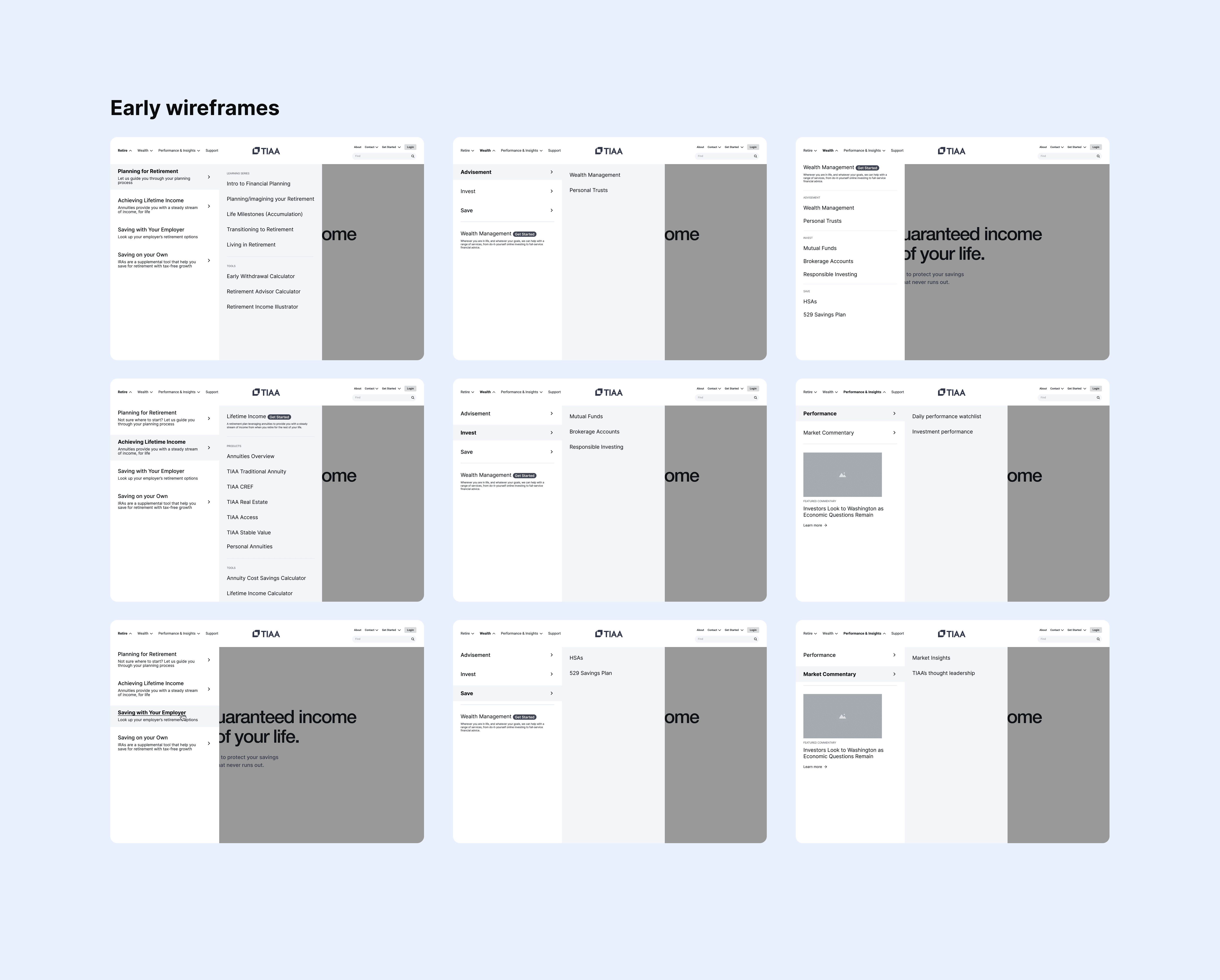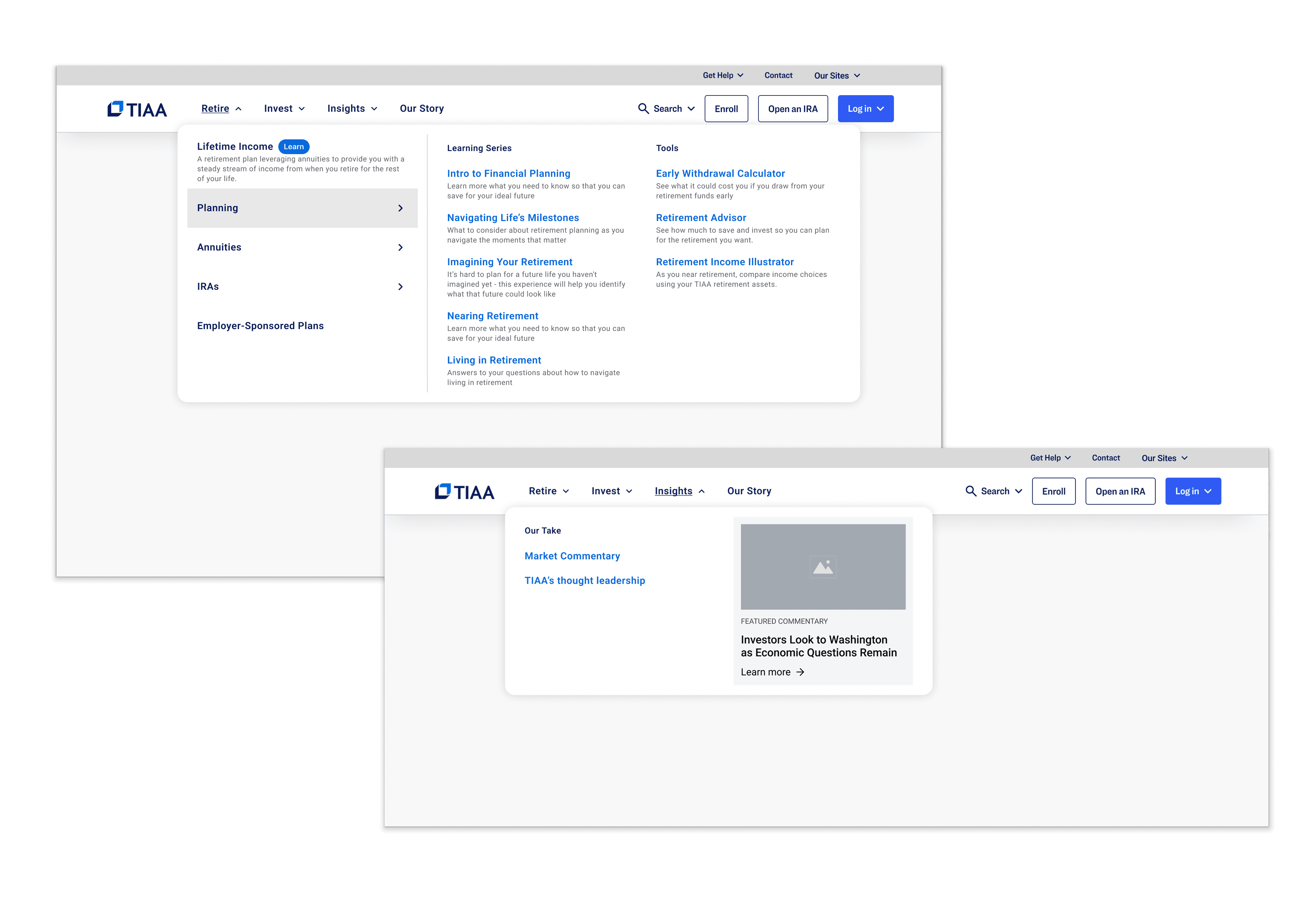 TIAA’s navigation needed to scale across multiple business lines and audiences but was overloaded, inconsistent, and difficult to manage. Working with a Behavioral Experience Designer, an Ethos system designer, and multiple development teams, I led the creation of a modular megamenu framework that brought structure, accessibility, and long-term scalability to TIAA’s digital ecosystem.