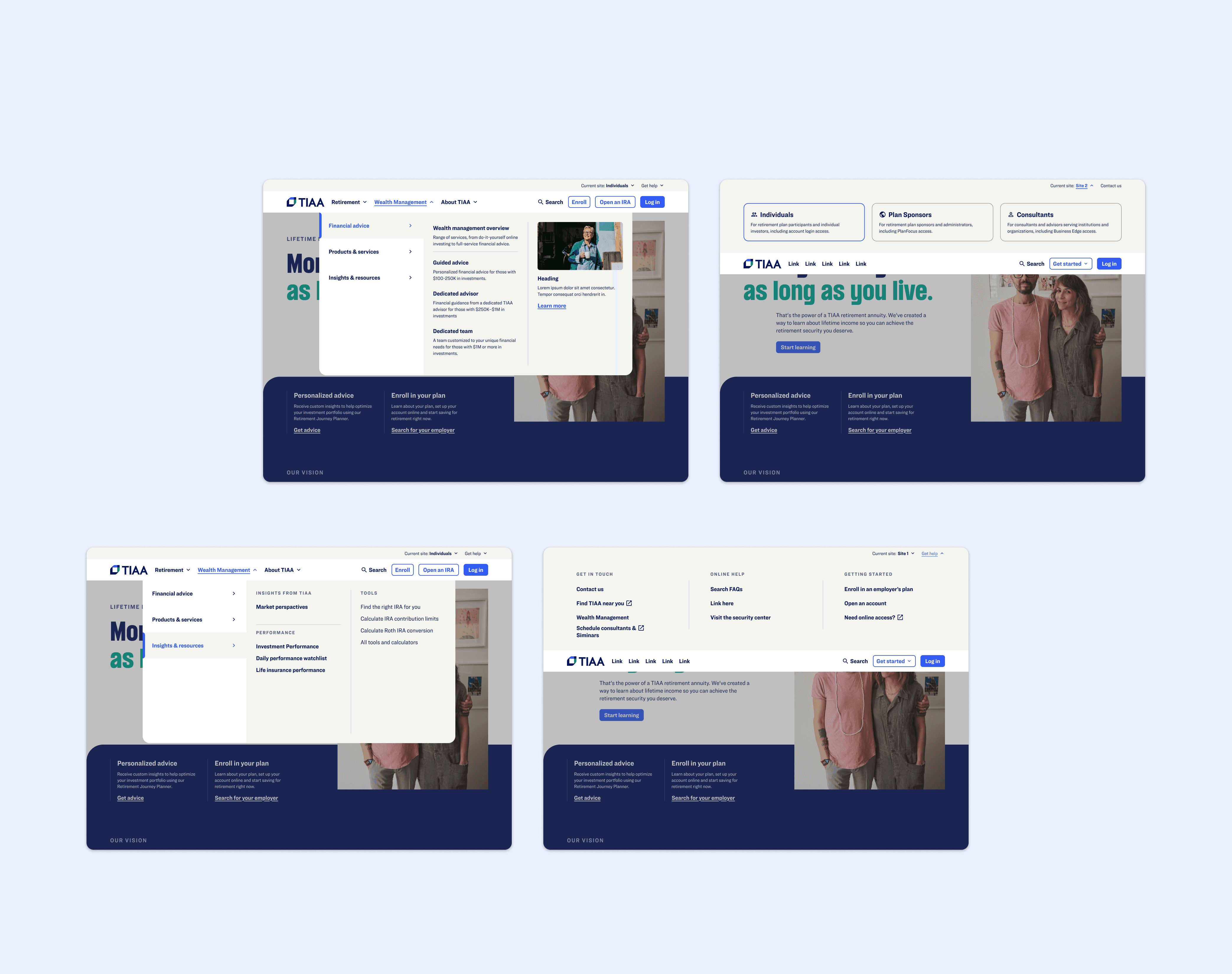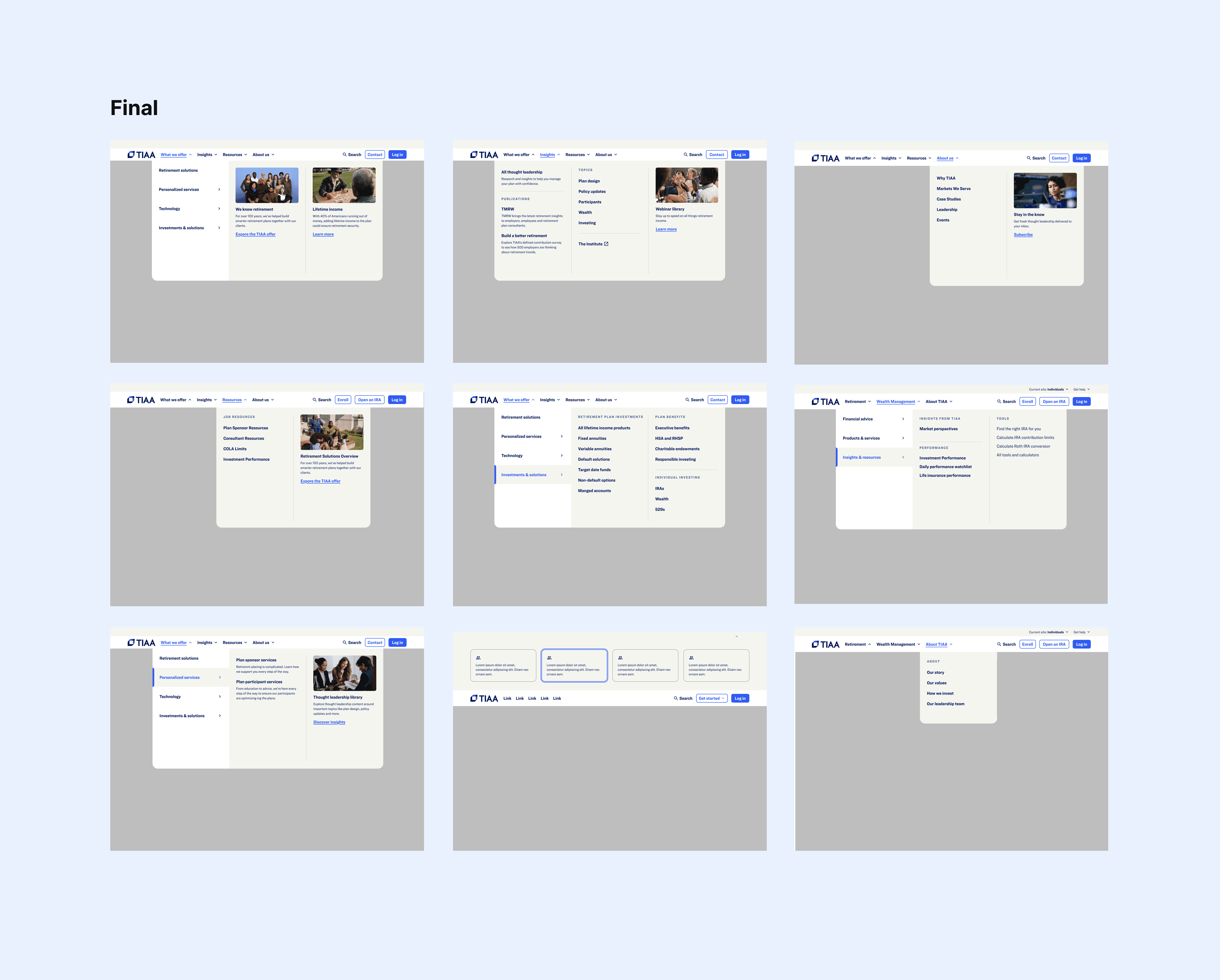 Working closely with a Behavioral Experience Designer, an Ethos system designer, and multiple development teams, we created a modular, federated navigation framework. The system introduced a multi-column layout that organized content by user intent and business priority. It supported different layout configurations so each audience—consumer, institutional, and participant—could see navigation tailored to their needs. Responsive behavior was defined across all major breakpoints, and accessibility standards were built in from the start. Comprehensive Figma documentation provided variants, behaviors, and developer specs to ensure consistency across teams and future scalability.