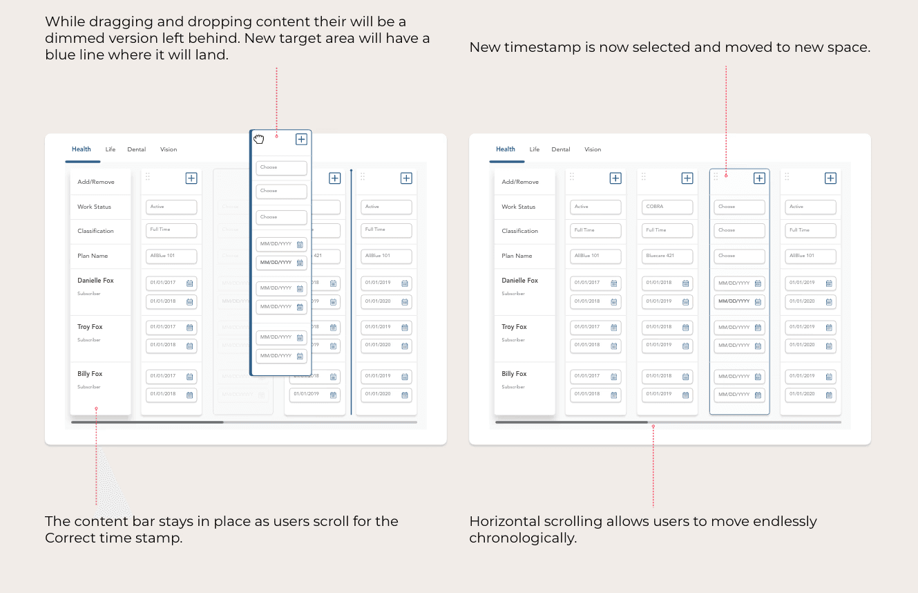 A chronological time-stamping model We redesigned the time-stamping experience around a clear, chronological model that grouped plans, classifications, and statuses by date. This allowed agents to understand history at a glance and make changes with confidence. By keeping related data visually aligned and predictable, the system reduced mistakes during complex updates and removed the need for manual fixes outside the platform.