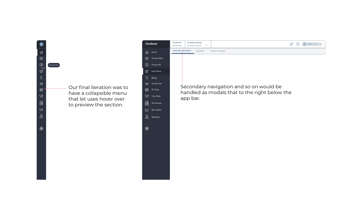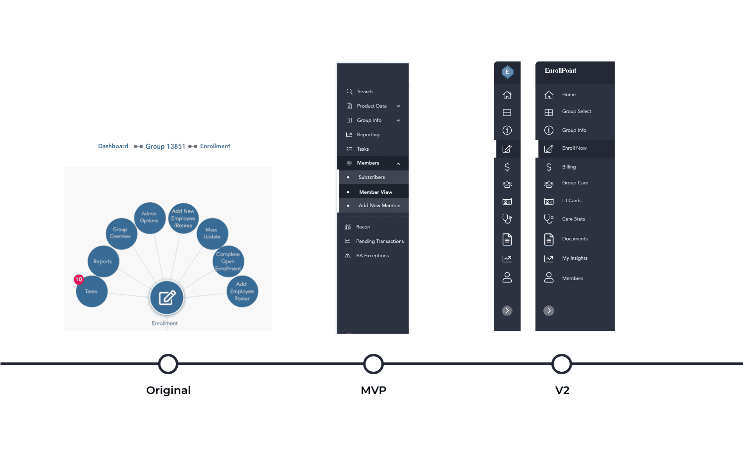 The original system relied on node-based menus, utility dropdowns, and breadcrumb backtracking that frequently reset progress mid-task. We replaced this with contextual actions embedded directly within enrollment screens. By placing controls where actions naturally occurred, the system became easier to scan, easier to learn, and easier to trust. Agents could stay focused on the task in front of them instead of figuring out where to go next.