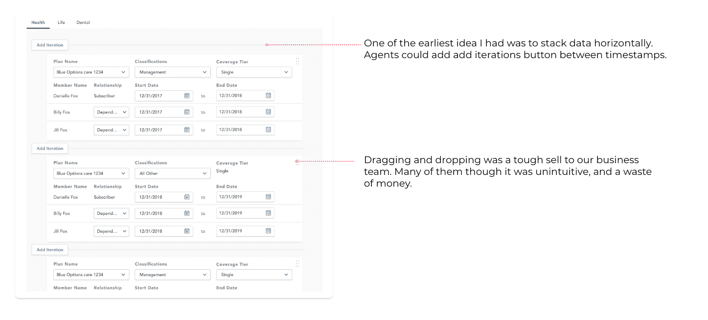 Designing for trust in complex data changes Solving time-stamping required heavy iteration. Early concepts explored horizontal timelines and more flexible interactions, but many introduced risk or confusion during complex edits. Business partners were especially concerned about accidental changes, which forced us to balance flexibility with safety.