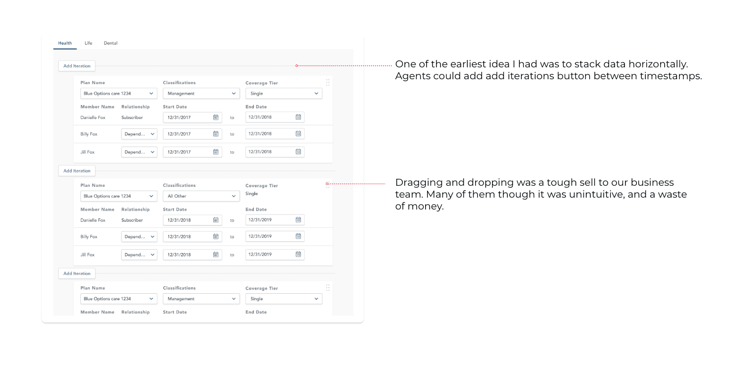 Solving time-stamping required heavy iteration. Early concepts explored horizontal timelines and flexible interactions, but many introduced risk during complex edits. Business partners were especially concerned about accidental changes, forcing us to balance flexibility with safety. We prioritized clarity and control over clever interactions—anchoring edits to a chronological structure and using deliberate interaction states reduced hesitation and rebuilt trust in one of the system's most fragile areas.