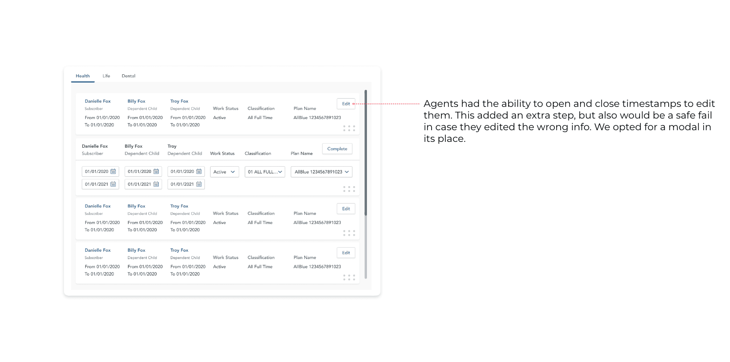 Updating time-sensitive health data was one of the most fragile parts of EnrollPoint. Agents needed to re-date member activity without breaking records or losing context. We redesigned the time-stamping experience around a clear, chronological model that grouped plans, classifications, and statuses by date. This allowed agents to understand history at a glance and make changes with confidence, removing the need for risky workarounds.
